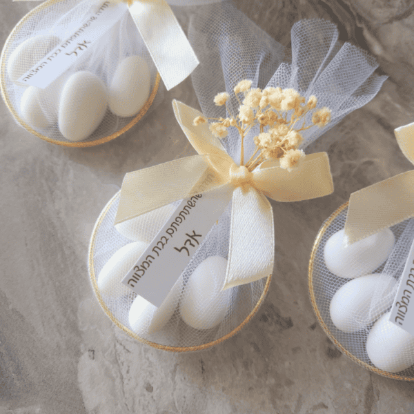 מתנה לאורחים חישוק מוזהב עם סוכריות דרג׳ה בעיטוף טול עם פפיון סאטן, גיבסניות והקדשה אישית