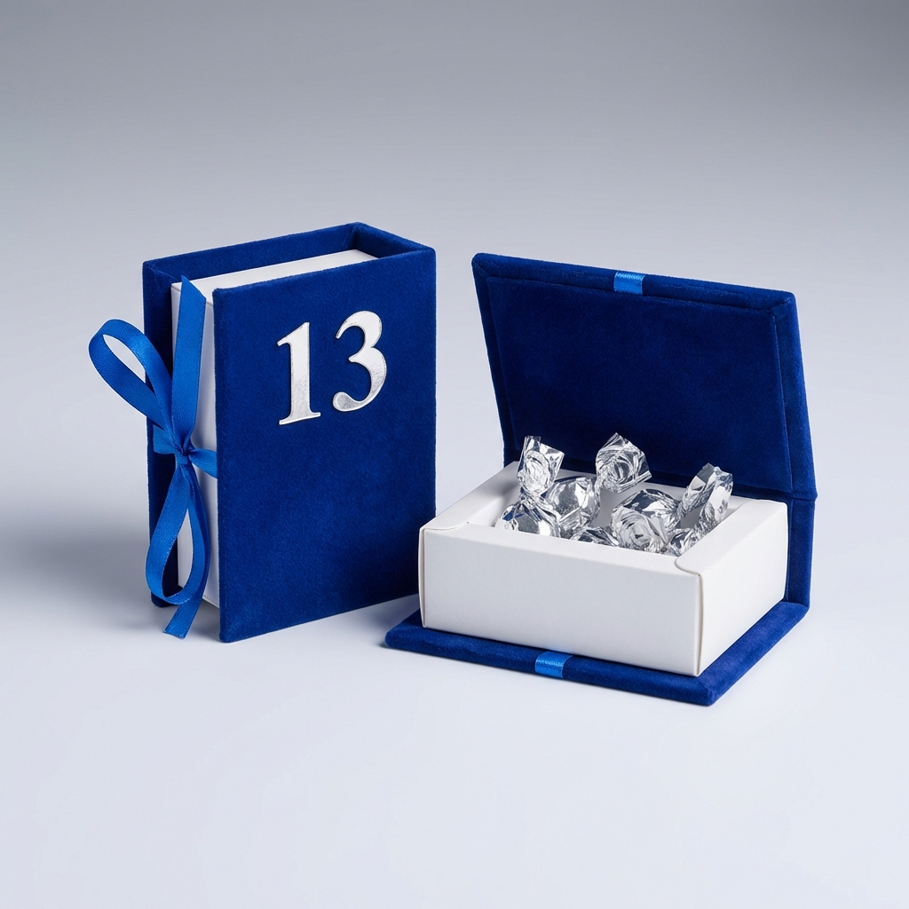 הקופסא מבד קטיפה בצבע כחול עם המספר 13 בצבע כסף.